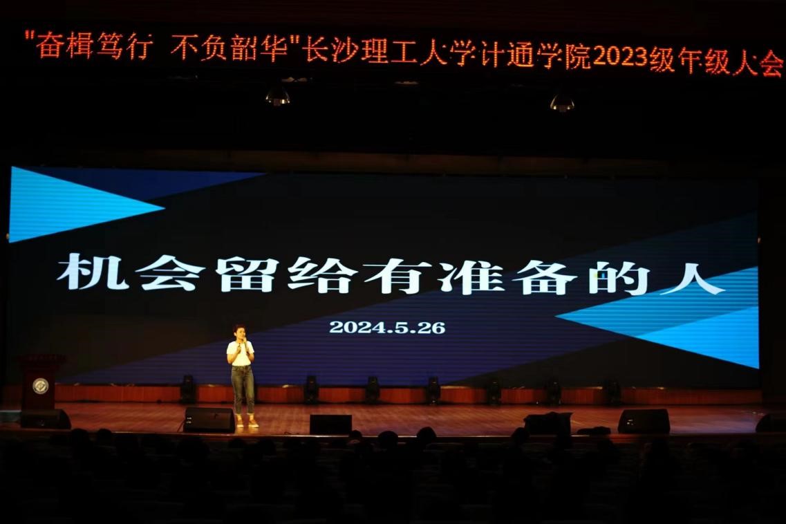 5月26日晚,计通学院在金盆岭校区五教大礼堂召开2023级本科生年级大会。本次大会以“奋楫笃行,不负韶华”为主题,院党委副书记王觊婧、23级辅导员刘洋、23级辅导员刘俊出席,计科2302班王添艺主持,2023级全体本科生参加。