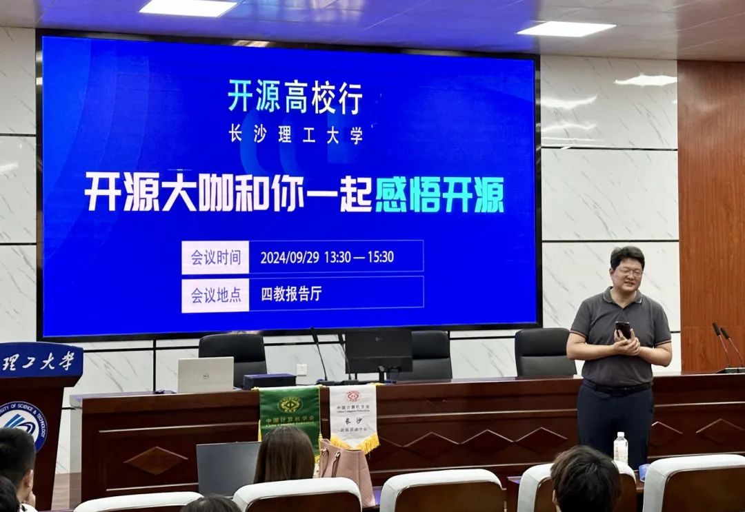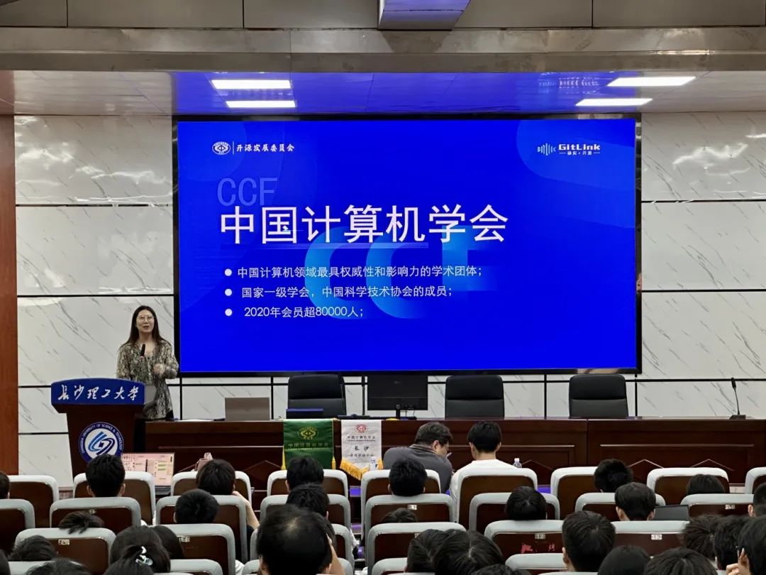 随后,CCF开源发展委员会执委王天阳向在场师生介绍了CCF开源发展委员会的成立初衷、运营的开源平台以及委员会所举办的开源创新大赛等活动。她强调了开源技术在推动技术创新和人才培养中的重要作用,并鼓励学生们积极参与到开源社区中,贡献自己的力量。
