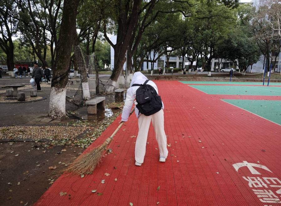 活动现场,同学们分工协作、热情投入。在学生公寓区域,大家手持扫帚、簸箕,细致清理墙角、绿化带的杂物,让 “西苑 5 号”“西苑7号” 等周边环境整洁如新;南苑篮球场上,同学们专注清扫落叶,红色与绿色的运动场地在劳动中恢复清爽;普法宣传栏旁、停车场周边,学子们不放过任何卫生死角,以劳动汗水换来校园环境的焕然一新。无论是团队协作清理公共区域,还是个人专注处理细节,都彰显着计算机学院学子积极向上的劳动风貌。
