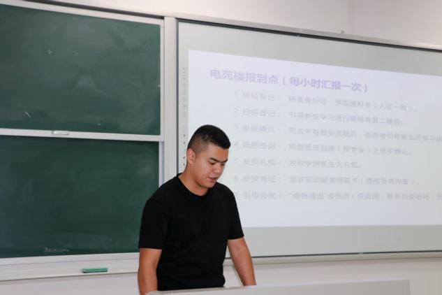 培训会围绕迎新核心工作开展,首先明确关键时间节点:新生9月13日-14日报到,14日下午、晚上分别召开新生家长会与首次班会,15日举行开学典礼。工作内容上,迎新志愿者需提前联系新生,并引导新生完成身份确认、军训服购买、宿舍入住等流程;电苑楼报到点严格执行“核验身份、扫码登记、系统确认、纸质签到、发放礼包、发放军训卡、引导咨询”七步流程,并实时汇报进度。
