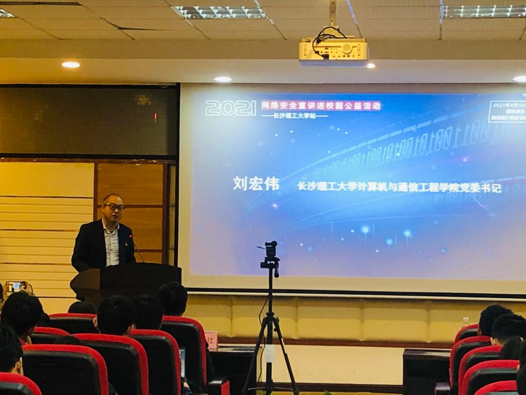 刘宏伟表达了对工信部等各方领导来宾的欢迎和感谢,强调在建党百年的关键时刻、在第六个“全民国家安全教育日”开展网络安全宣讲,对于引导广大青年远离电信网络诈骗、维护广大青年学生网络安全利益、保障国家网络安全有着重要意义。