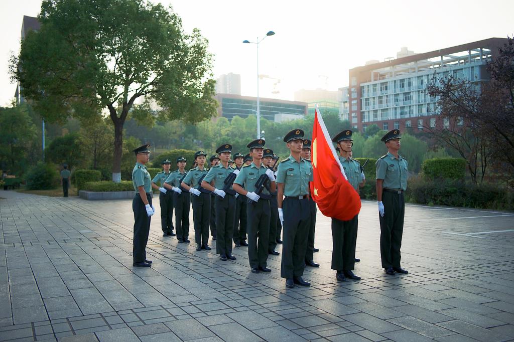 “五星红旗迎风飘扬”,在嘹亮的歌声,国旗班同志们踏着坚定有力的步伐护送国旗进场。伴随着慷慨激昂的《义勇军进行曲》,全体师生庄严肃立,注视着鲜艳的五星红旗冉冉升起,高高飘扬在学校上空。国旗下,全体同学庄严宣誓:志存高远,坚定信念,热爱祖国,服务人民!誓言铿锵、回声嘹亮,深情诠释了计通学子立志成才,为国奉献的决心。
