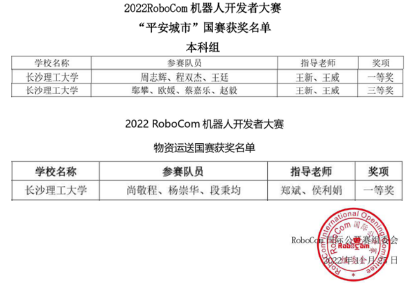 近日,2022RoboCom睿抗机器人开发者大赛圆满落幕,经过激烈角逐,我院学子凭借扎实的专业知识、动手能力和创新能力在“平安城市”、“物资运送”两个赛道斩获佳绩,获全国一等奖2项,三等奖1项。