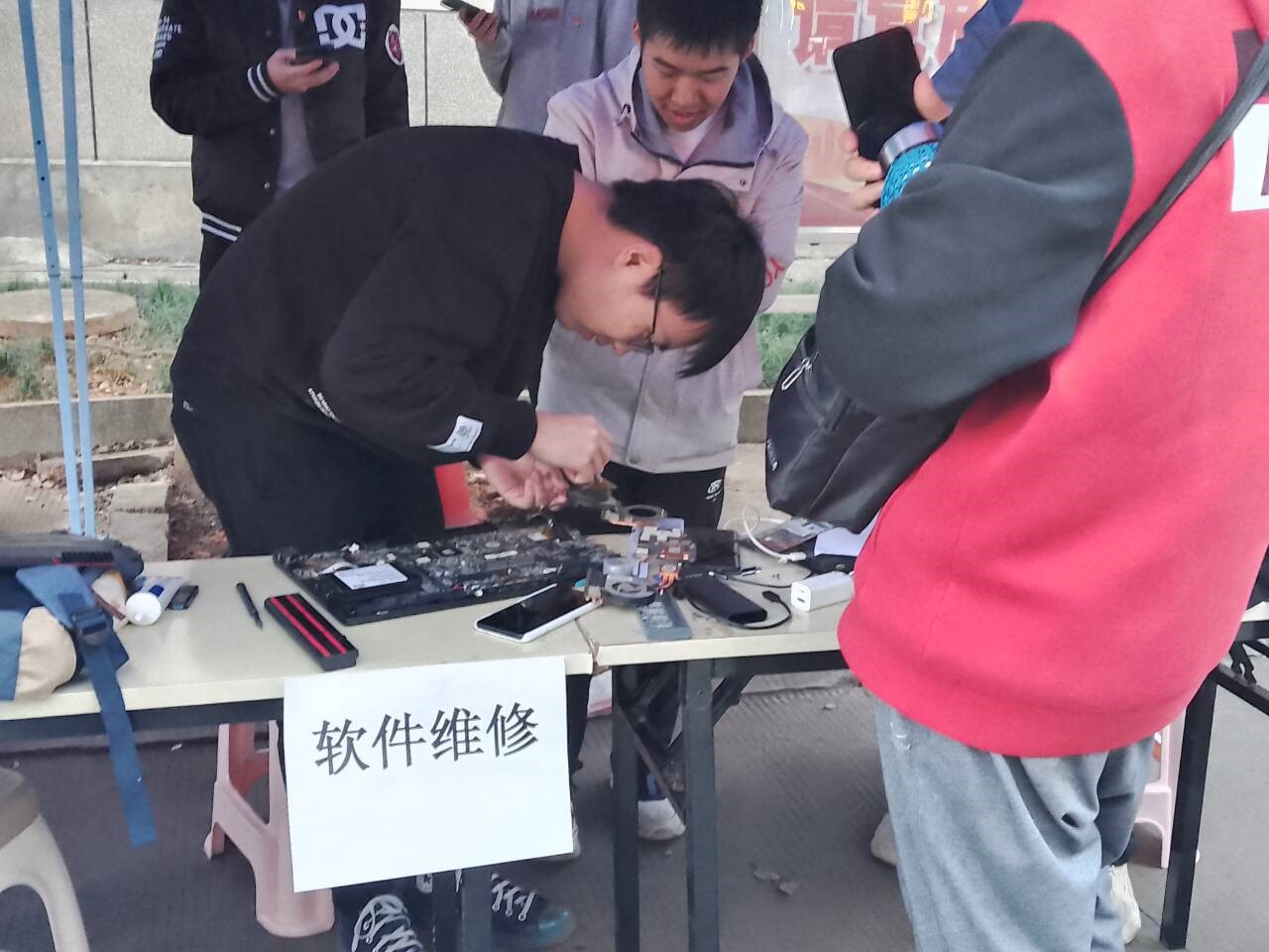 本次活动采取线上宣传、线下摆台同步进行。软件方面,义务维修人员将对有需要的同学进行软件安装、系统重装、软件卸载、软件清理和磁盘清理等。硬件方面,内存条添加、硬板清灰、装固态硬盘,义务维修人员积极解决同学们提出的需求。除此之外,义务维修人员还提供关于计算机有关常识等咨询服务。此次活动吸引许多同学前来询问,活动现场气氛十分活跃,维修员们都忙的不亦乐乎。