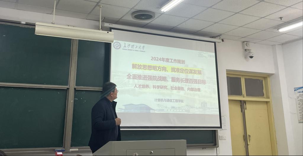 会议第二阶段为学院2024年度工作规划报告。党委副书记王觊婧传达并带领全体教职工深入学习全国两会精神。张锦以“解放思想明方向、找准定位谋发展”为题围绕人才培养、科学研究、社会服务等方面详细解读了新一年学院事业发展的重点工作目标,并号召全院教职工团结奋斗,勇毅前行,全面推进强院战略,服务学校“百强”目标。副院长蔡烁针对教学工作做了补充发言,强调要切实抓好学院教风、学风、考风建设。刘朝辉作总结发言时说,高校是发展新质生产力的桥头堡,全院上下要铆足干劲谋发展、提高站位看课堂、立足交叉抓科研、从严治教树新风,努力推动学院高质量发展。