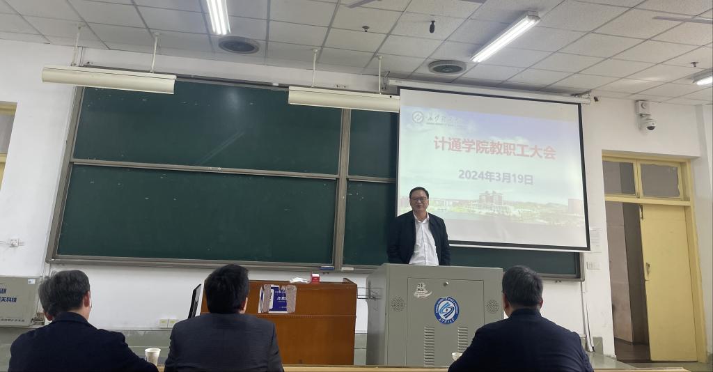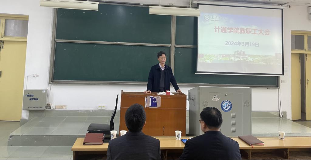 3月19日下午,计通学院在1教A101室召开新学期第一次教职工大会,校党委委员、副校长刘朝晖,组织部常务副部长陈曦出席会议,会议由院长张锦主持。