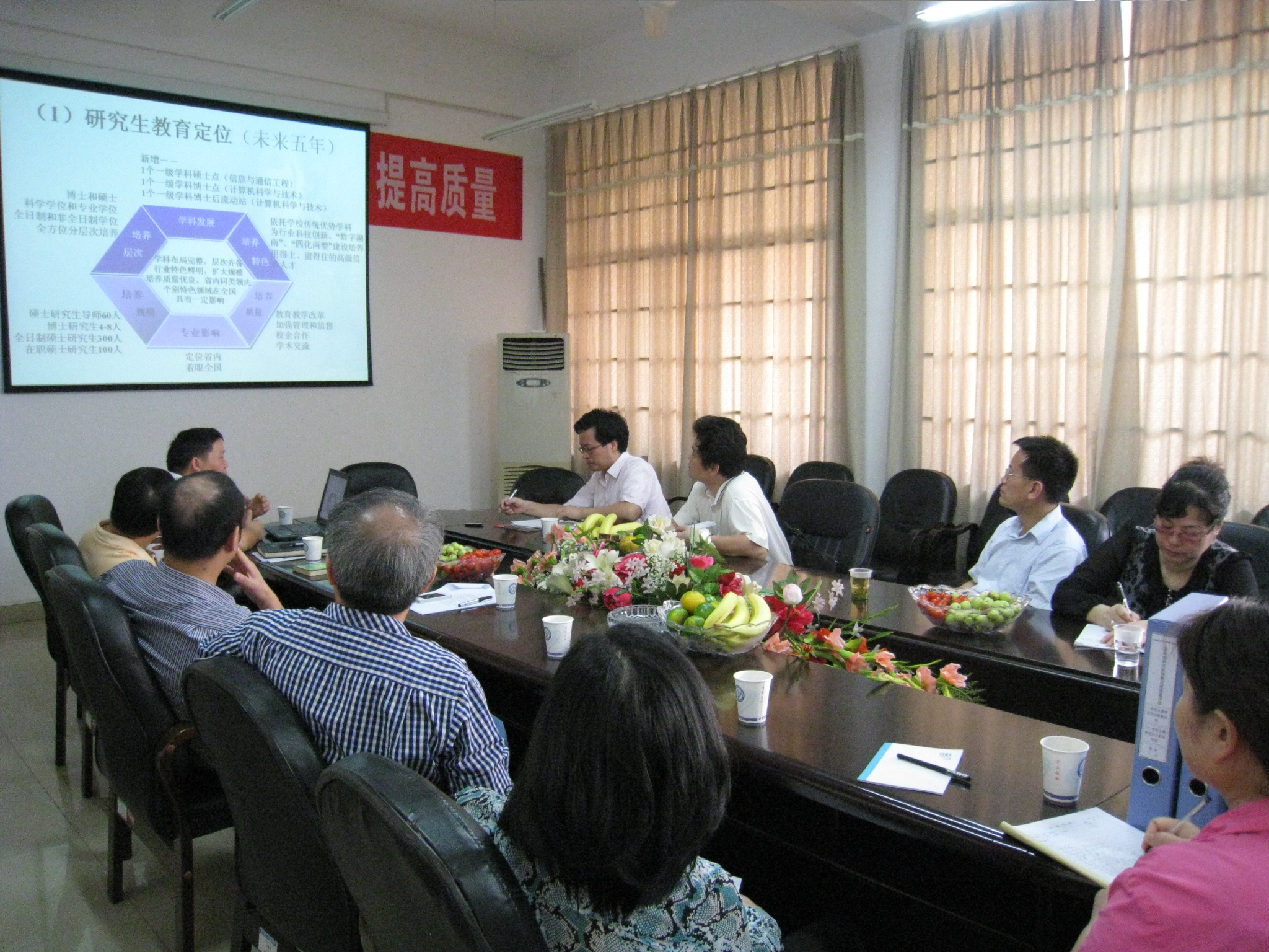 叶泽副校长对我院的迎评工作进行了指导,并对我院迎评准备工作给予了充分的肯定,同时也指出研究生教育工作应更好地突出特色,重视研究生教育过程中方式方法的完善和思索,进行教研教改创新,以跳跃式思维发展科研,为研究生提供更好的实践平台。最后,数计学院李应求院长、周富照、黄斌等领导专家认真仔细地检查了我院的评估材料,并提出很多宝贵意见。