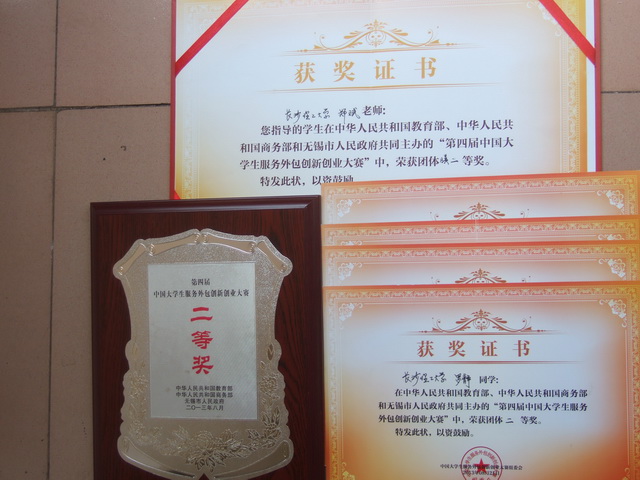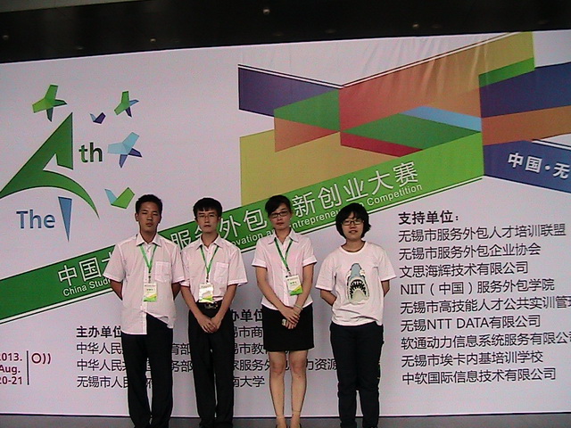 第四届中国大学生服务外包创新创业大赛由教育部、商务部和无锡市人民政府共同主办,于8月20-22日在无锡市太湖国际博览中心举行。开云官网计算机与通信工程学院郑斌、黄敏两位老师指导的学生(罗静、张洪龙、李平、匡姝)在第4届中国大学生服务外包创新创业大赛中荣获团体二等奖!