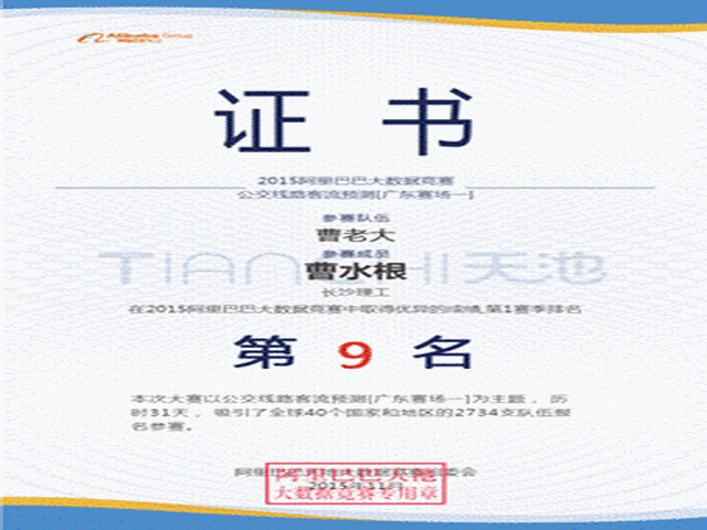 在刚刚落幕的2015阿里巴巴天池大数据竞赛中,开云官网计算机与通信工程学院14级研究生曹水根同学荣获第九名。