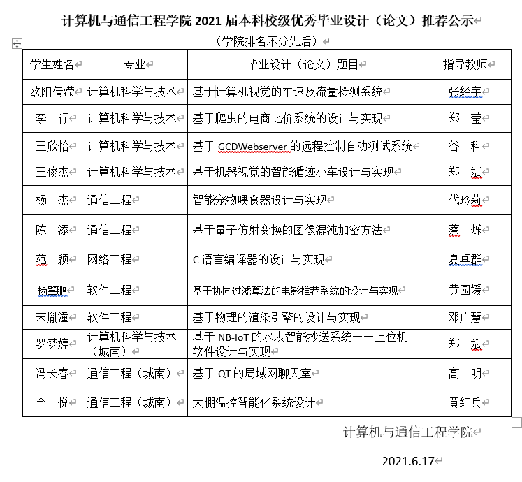计算机与通信工程学院 2021届本科校级优秀毕业设计(论文)推荐公示