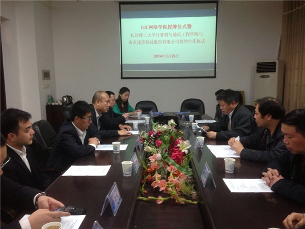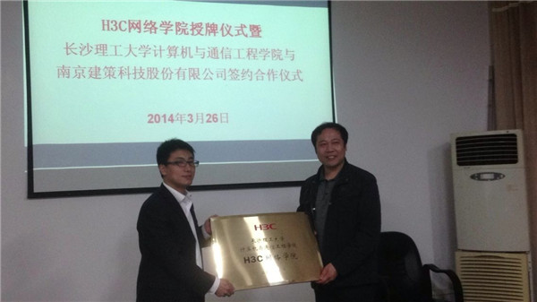 3月26日下午,我院与H3C网络学院、南京建策科技股份有限公司在理科楼一楼会议室举行H3C网络学院授牌仪式和校企合作签约仪式。院长李峰、H3C网络学院培训部部长朱冬光、南京建策科技股份有限公司总经理王继锋、我院领导、各部门负责人及企业负责人参加了此次活动。