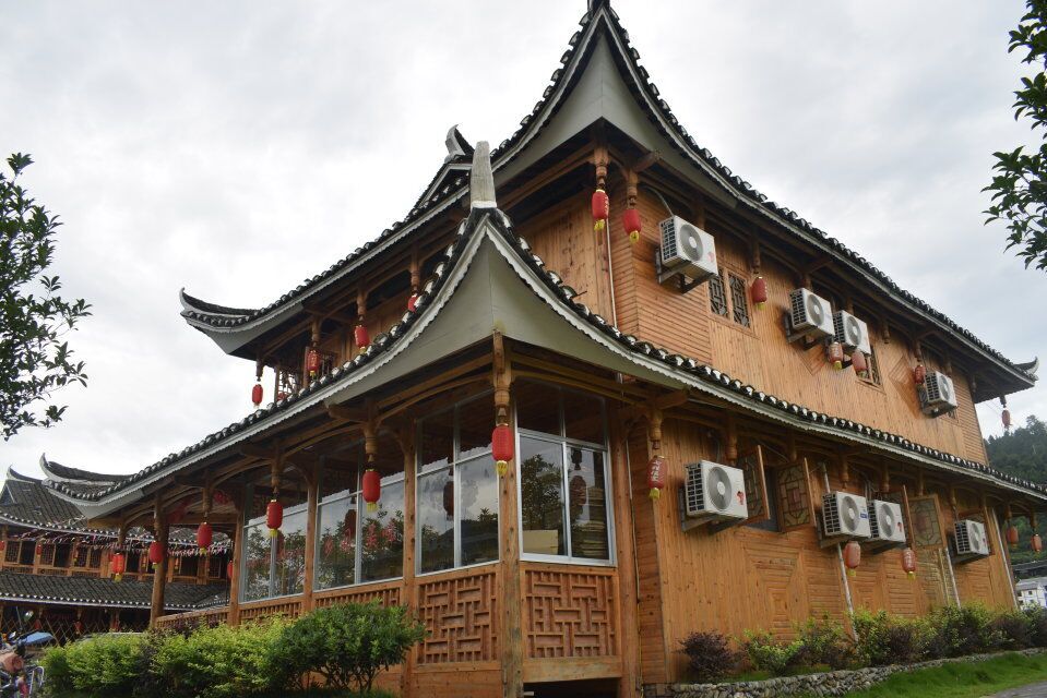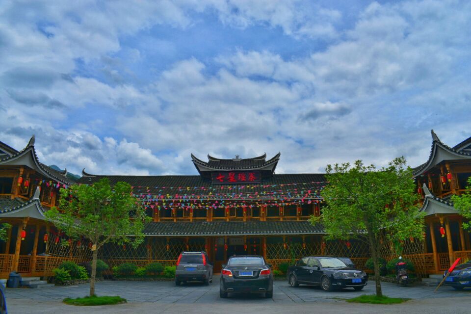 七姓瑶寨位于溆浦县广阔的田野中,瑶寨前方的二都河是稻田和花海的最美分界线。瑶寨整体呈现对称状,主要是用天然的木材搭建而成,构造时采用了独特的方法,使瑶寨牢固却不浪费木材。支农实践团的成员们都对七姓瑶寨赞不绝口。据瑶寨负责人介绍,七姓瑶寨所在地原为田野,是为响应当地政府扶贫的口号,在政府的支持下由村民所建,其名字则是根据当地历史“七姓瑶”而来。