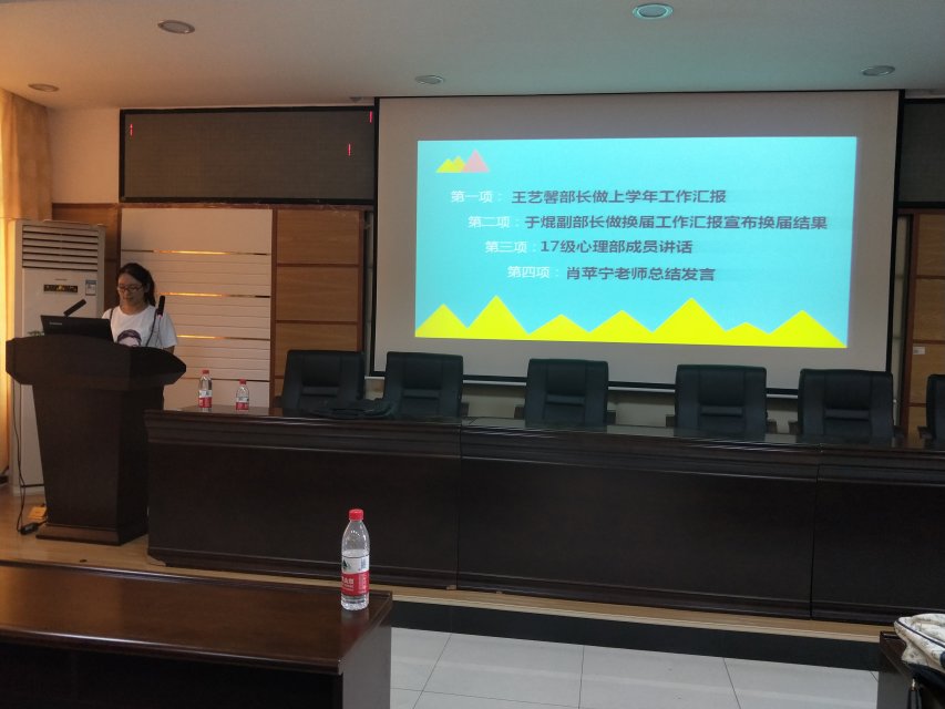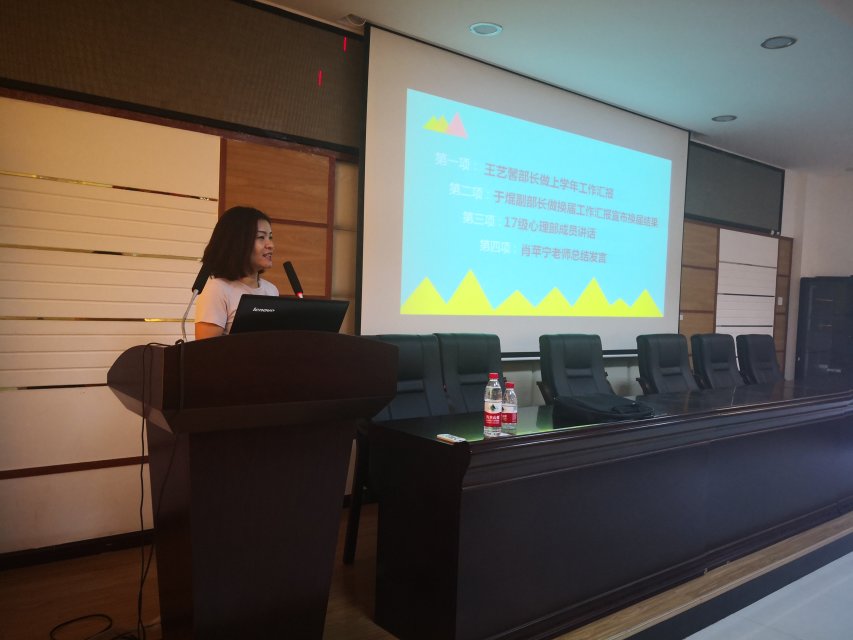 会议伊始,心理部王艺馨就上学期的工作做了详细的汇报,让每一位参会人员更好的了解到了上一学年心理部的所有工作。其次,部长表达了对老师,同事及各位心理委员的感谢。最后简述了对心理部未来的憧憬。