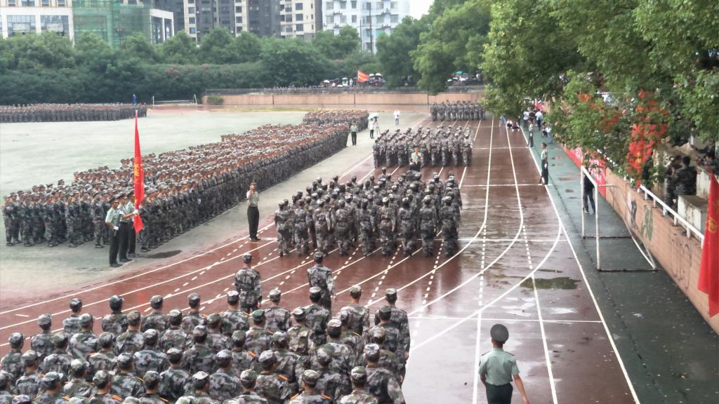 大会在激昂的国歌声中拉开帷幕。此次大会主要包括军训汇报表演和分列式合练两个部分。民兵连女教官的匕首操英姿飒爽,新生的擒敌拳和军事技能演练声势浩大,气势磅礴,赢得了在会领导、师生和家长们的热烈掌声。本次,我院共有四个方阵接受检阅。在教官指令下,受阅方阵迈着整齐的步伐、喊着嘹亮的口号,走过主席台接受检阅。他们动作整齐划一,气势如虹,充分展示了军训的优秀成果以及计通学院新生昂扬向上的精神风貌。在军训汇报大会中不难发现,新生们在这次军训中磨练出了坚强的品格,彰显着刚毅顽强的血性。即使突降大雨,他们也屹立在操场上,个个精神抖擞、英姿飒爽。