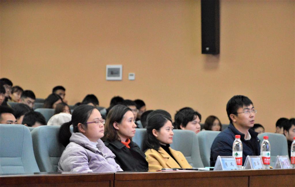 大会第一项,全体起立奏唱团歌。然后是出席老师讲话。肖凤老师从“什么是团情”和“什么是团心”两个方面告诉了大家如何自我管理,自我提升;并希望大家在未来的学习生活中秉承团情、怀揣团心更好地为计通学院服务。郑国义老师则以聊天的方式讲述团委的过去与如今,并希望大家在新的一年里能够撸起袖子加油干。大会第二项,党委副书记陈华讲话。陈华书记从“朝夕必争,不负韶华”和“初心如磐,使命必达”这十六字,对大家寄予厚望,希望大家秉承初心,不负前行。大会第三项,各部门部长述职。各个部门的部长分别用PPT、视频的形式向全体学生会干事及老师们展示了2019年来的付出与成绩,反思了部门的不足,并对2020年的工作做出展望与规划。大会第四项,院团委书记潘枝花讲话。潘老师首先总结了该次参会人员的表现,表达了对大家的肯定。然后潘老师便对各部门的述职进行总结,既指出了不足,也肯定了优点。大会第五项,宣读“荣誉部门”名单,并现场给予了前三部门与后三部门“奖励”。