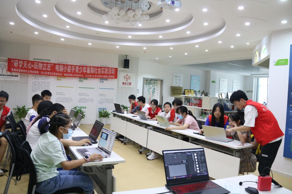 近日,计通学院携手青园街道新时代文明实践所、天心区青年志愿者协会、湖南李丽心灵教育中心共同举办“玩物立志:青少年电脑小能手实践活动”。计通学院10名学生在指导老师潘枝花带领下,前往湘园社区开设有关计算机网络和电子游戏的知识讲堂。