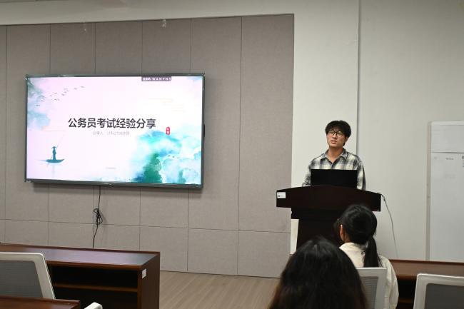 在公务员考试经验分享环节,陈昂和崔雨珊分别作了专题分享。陈昂系统分析了不同公务员岗位的特质,并分享了阶段化备考方案及优质师资资源;崔雨珊则聚焦行测和申论两大板块,详细讲解了模块化训练、全真模拟以及素材积累、写作训练等备考技巧。