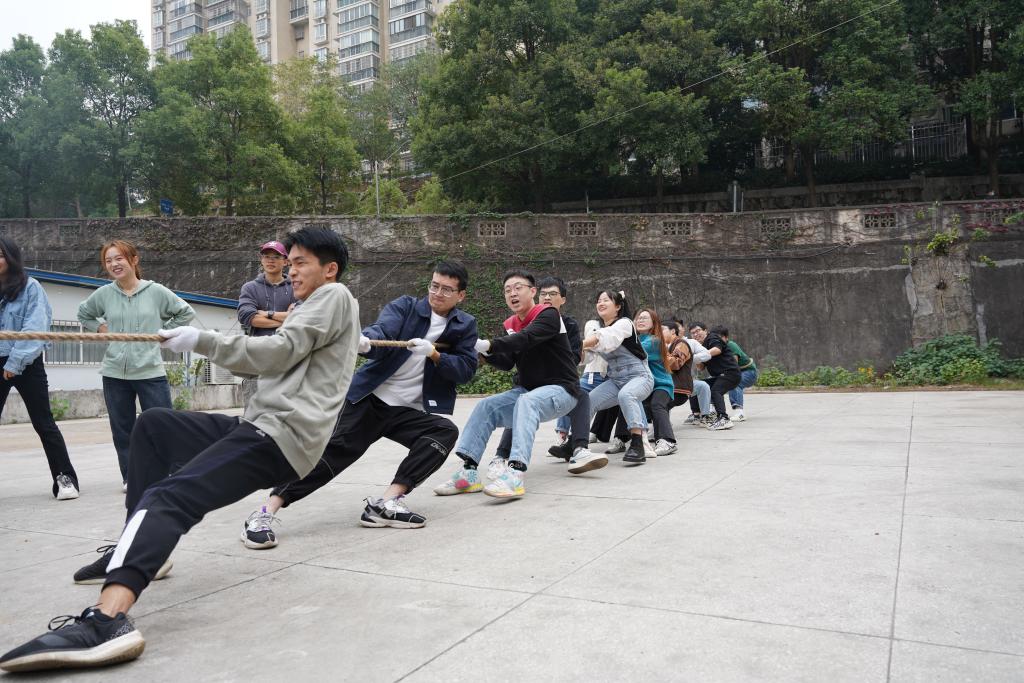 此次趣味运动会项目有两人三足、家乡话传递、运气球、无敌风火轮、拔河,2021级、2022级共计120多名研究生共同参与。所有项目都是团队作战,比赛过程中,欢笑满满,展示了青年人的激情与活力。