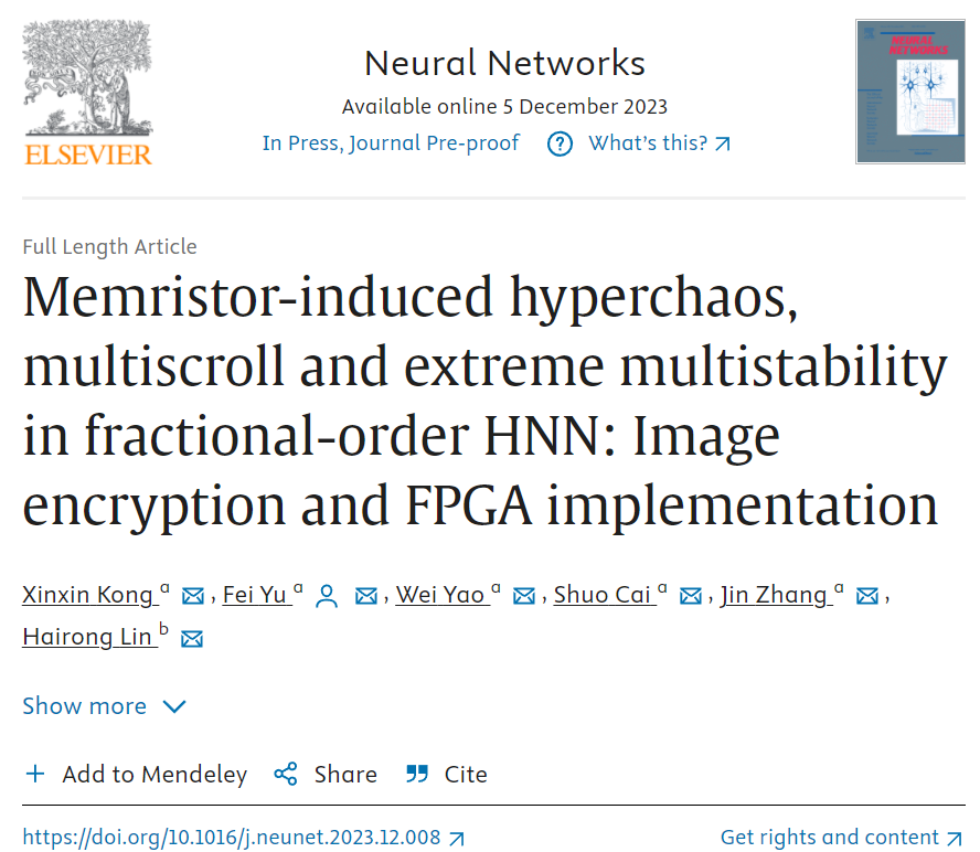 近日,我院余飞副教授与合作者在人工智能领域顶级期刊《Neural Networks》上发表了论文“Memristor-induced hyperchaos, multiscroll and extreme multistability in fractional-order HNN: Image encryption and FPGA implementation”(https://doi.org/10.1016/j.neunet.2023.12.008)。学院研究生孔新新为第一作者,导师余飞副教授为通讯作者。Neural Networks作为中科院1区,CCF人工智能方向的B类期刊,是人工智能学科顶级期刊,收录了人工智能领域最前沿的高端论文,目前影响因子为7.8。