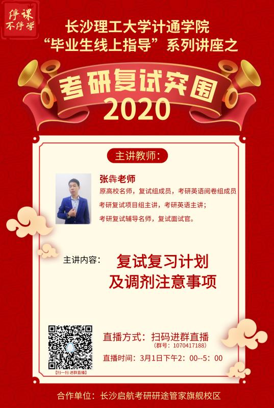 为提高学生考研成功率,帮助考研学生解决疫情防控期间复试准备中遇到的问题和困难提升考研学生复试技巧,确保考研工作做好做实,3月1日下午,我院召开2020届考研复试专题指导讲座视频讲座。
