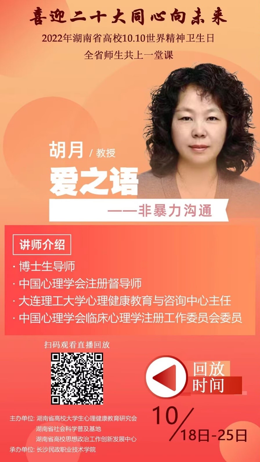 10月17日,计通学院组织全院学生收看“2022年湖南省高校10.10日世界精神卫生日——全省师生同上一堂课”第二场心理健康教育专题讲座。本次主讲人为中国心理学会注册督导师胡月教授,主题为《爱之语——非暴力沟通》。