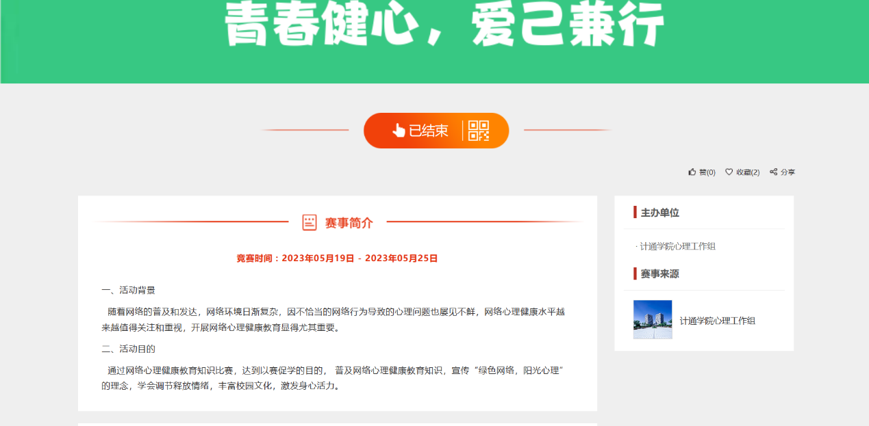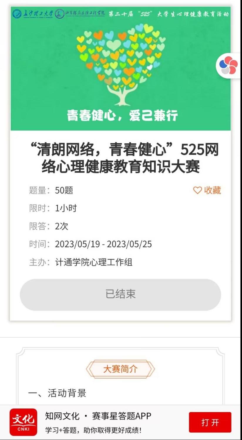 5月19日至5月25日,计通学院举办“清朗网络,青春健心”525网络心理健康教育知识大赛,旨在通过网络心理健康教育知识的普及和传播,提高青少年的心理素质和网络安全意识,从而保障他们的身心健康。