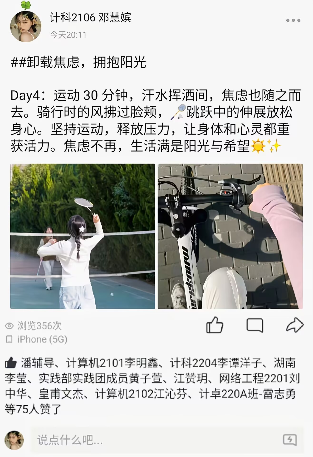 从认知到实践,同学们通过学院公众号平台了解了关于焦虑的心理知识,而后根据实际情况给自己的焦虑感受进行评分,之后再空间、朋友圈等平台发布说说,将焦虑释放,到第七天时候,和“焦油”们互相分享感受。