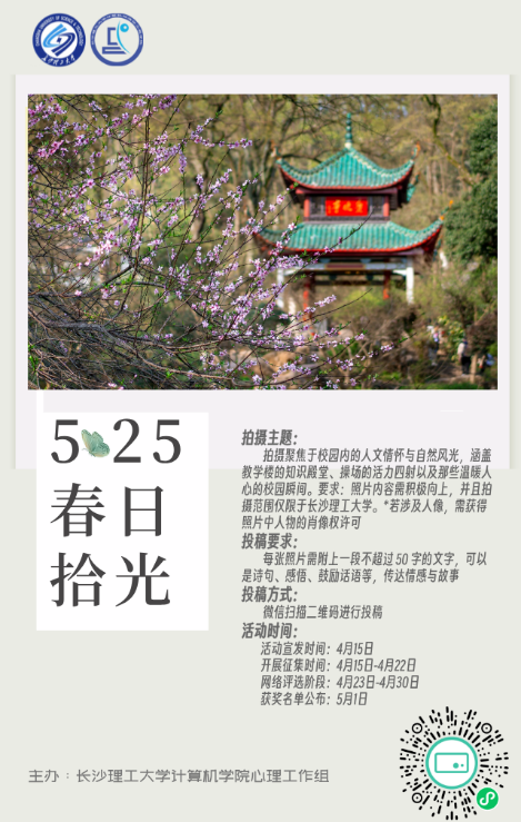 4月15日,计算机学院心理工作组发起“525春日拾光”摄影作品征集活动,旨在鼓励同学们用镜头捕捉校园中的美好瞬间,记录青春岁月里的独特印记。