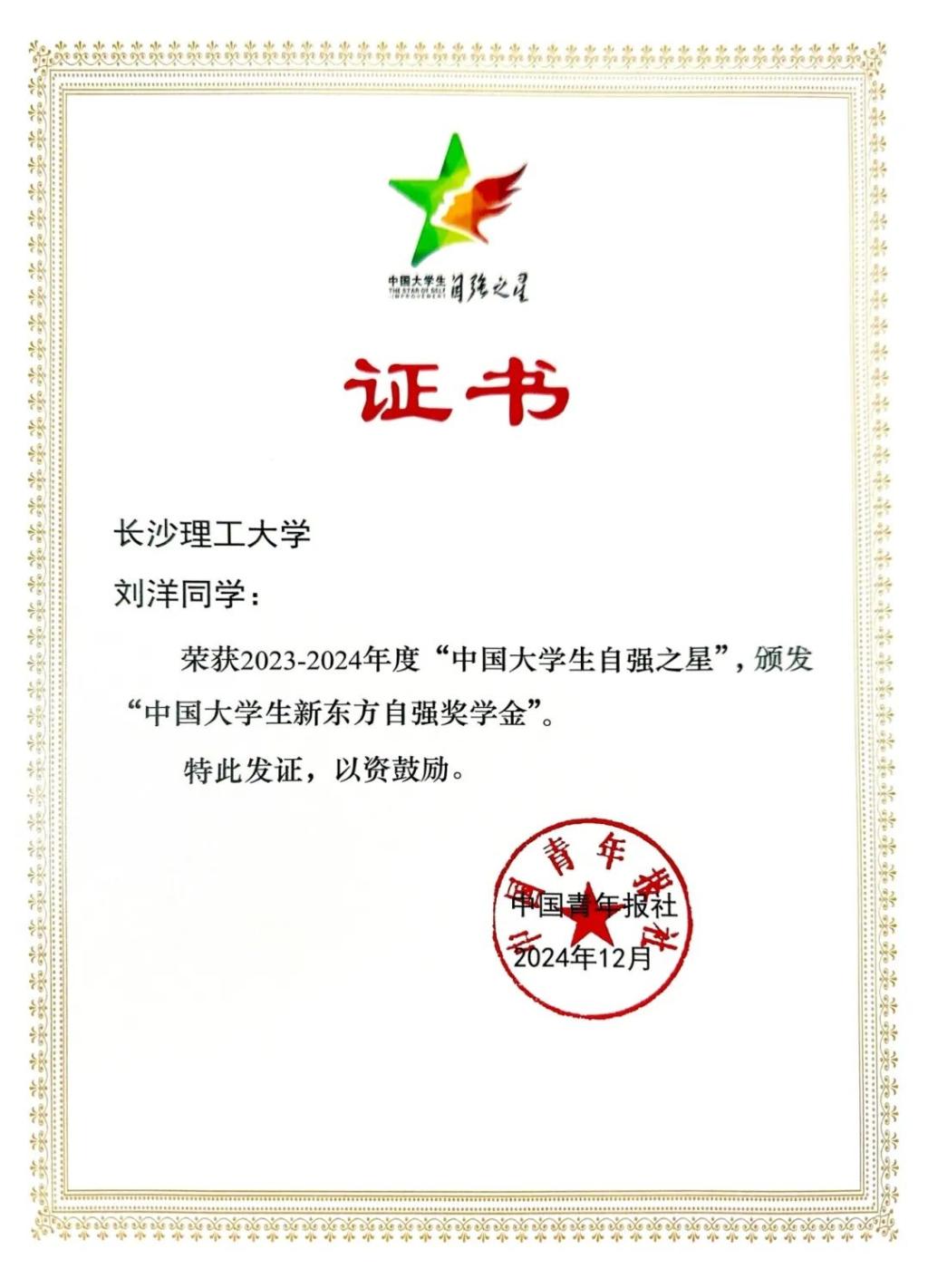 近日,由共青团中央、全国学联指导,团中央基层建设部、中国青年报社主办的2023-2024年度“中国大学生自强之星”奖学金推报活动结果揭晓,开云kaiyun体育交通学院交通运输规划与管理专业2020级博士研究生刘洋获评“中国大学生自强之星”荣誉称号。