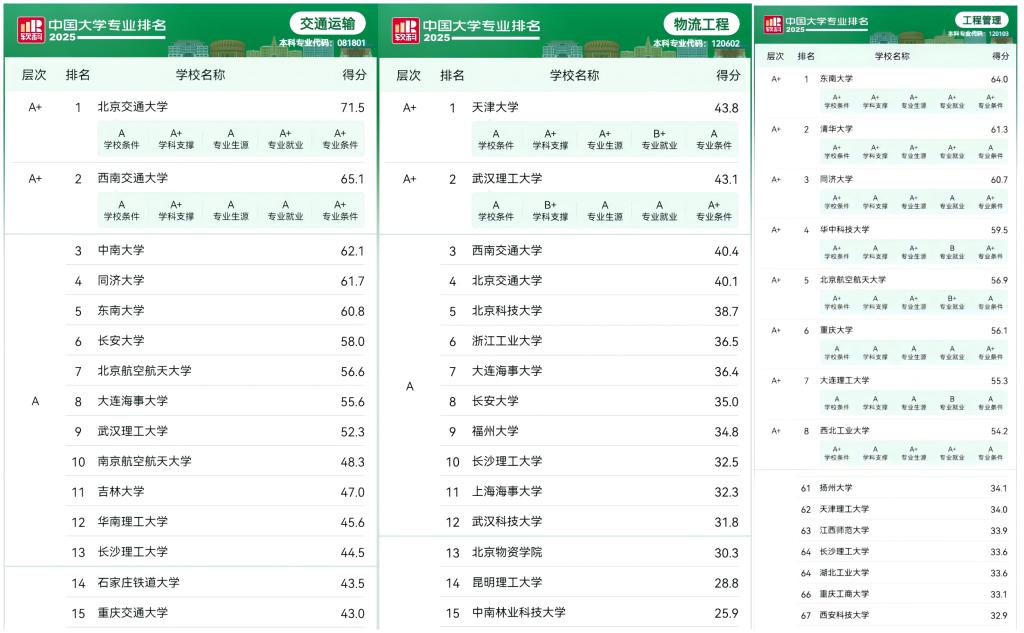 近日,高等教育评价机构软科正式发布《2025软科中国大学专业排名》。交通学院多个专业表现亮眼,其中道路桥梁与渡河工程专业位列全国高校第5名,物流工程专业排名全国高校第10名,交通运输与交通工程专业均位居全国高校第13名,工程管理专业位列全国高校第64名(参评高校共221所)。