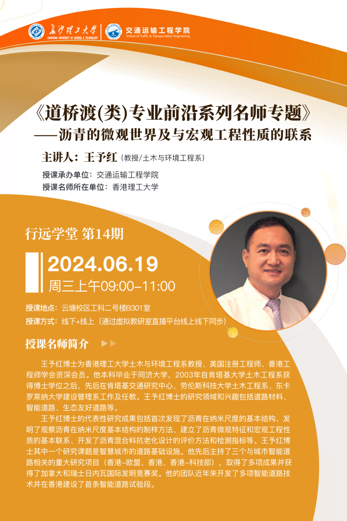 道桥渡(类)专业前沿系列名师专题:香港理工大学王予红教授谈“沥青的微观世界及与宏观工程性质的联系”