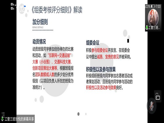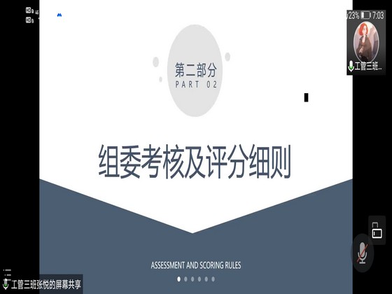 会议伊始,张悦对组委提出认真严谨、踏实肯干、计划性强和时刻具备服务意识四个要求。接着,张悦宣读了《组委考核及评分细则》,从加分细则和减分细则两个方面对组委的考核及评分进行了简要说明,同时展示了四月份部分组委的考核公示。最后,张悦介绍了获奖信息统计表的构成及填写要求,同时对各组委提出的相关问题进行了详细解答,并对近期工作进行了总结。