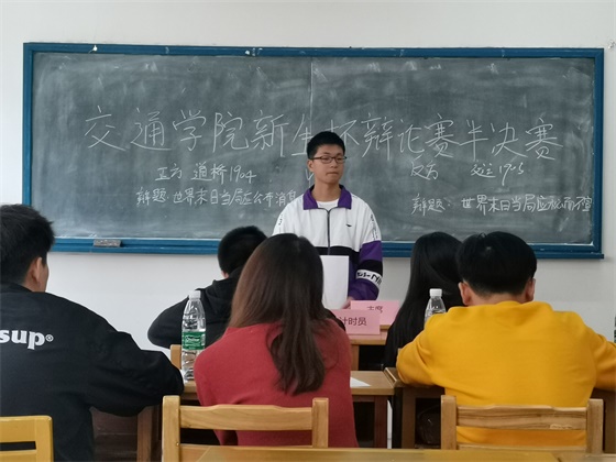 11月12日下午,交通学院2019级“新生杯”辩论赛半决赛于金盆岭校区十教2-B教室举行。交通学院云魂辩论队队员任评委,参赛班级分别为道桥1904班、交运1905班、工管1901班和工管1903班。