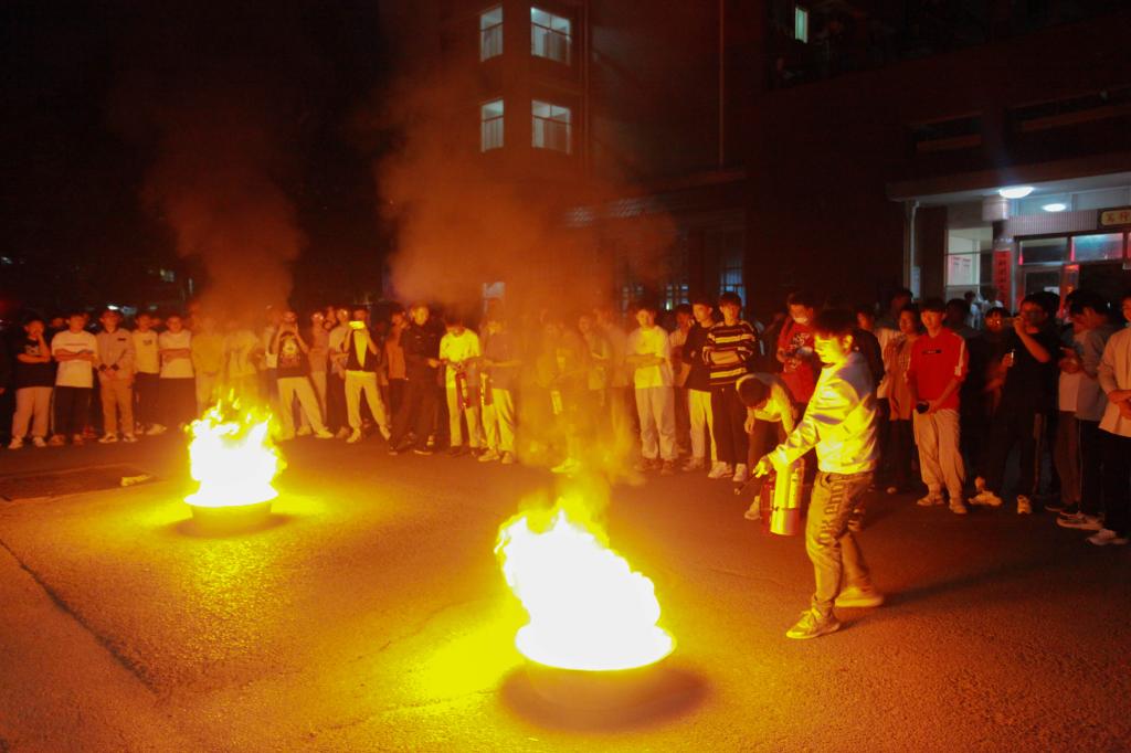 “各位同学在使用灭火器时,首先要取下喷枪,展开出粉管,然后用双手紧握喷枪,对准火焰边缘根部,最后拔掉保险销,打开灭火器阀门再扣动板机,由近至远灭火。” 消防疏散演练结束后,保卫处消防科易国安、石颐梵为同学们详细讲解了各类消防器材的使用方法,现场为大家进行灭火演示,并邀请同学们进行灭火器的操作体验。同学们踊跃尝试,在实践中很快掌握了灭火器和防毒面具的正确使用方法。
