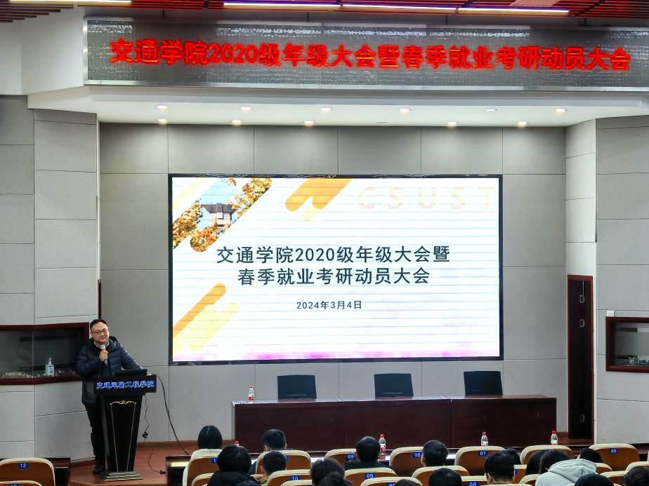 为推动2024届毕业生高质量就业,交通学院于3月4日下午在云塘校区工科二号楼B-301召开2020级年级大会暨春季就业考研动员大会,交通学院党委副书记副院长任志祥、研究生培养办刘文琳老师、学工办辅导员李特超老师和冯心崚老师以及全体毕业生参与本次会议。