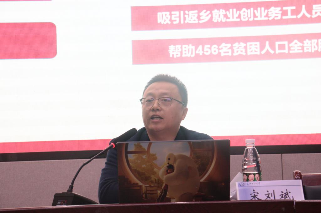 宋刘斌图文并茂地讲述驻村帮扶工作经历,表示四年的驻村生活,是他一生中最伟大的荣耀、最宝贵的经历、最难忘的不舍。他回忆道,枧杆山村原来是个省级深度贫困村、地质灾害村,但在学校党委确定的“党建引领脱贫、文化助力脱贫、产业推进脱贫”发展思路下,争取资金2700多万元,完成消费扶贫2400多万元,创造村集体经济收入累计超过90万元,吸引返乡就业创业务工人员45人,帮助456名贫困人口全部脱贫。