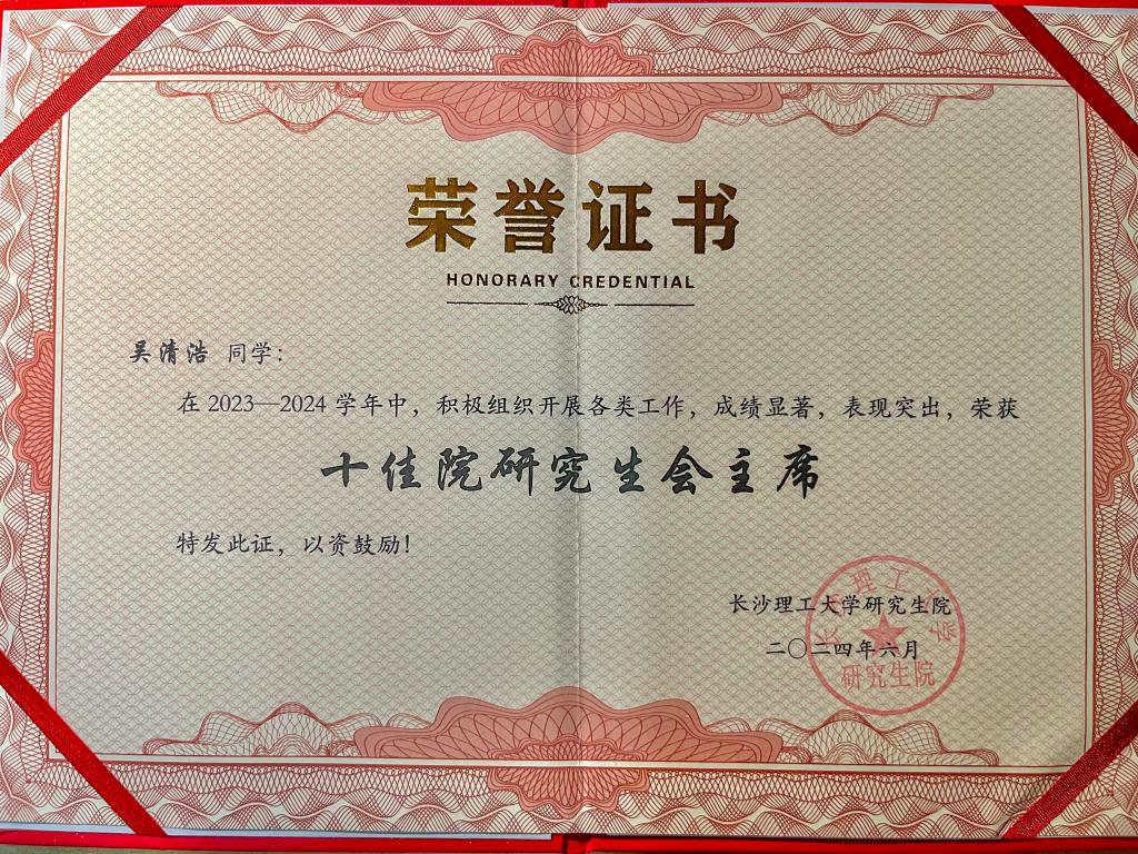 近日,开云kaiyun体育第十八次研究生代表大会闭幕式在云塘校区召开,现场对2023-2024年度表现突出的优秀学生会组织进行了表彰。交通学院研究生会再次获得年度“优秀院研究生会”称号,院研究生会执行主席吴清浩获评“十佳院研究生会主席”。