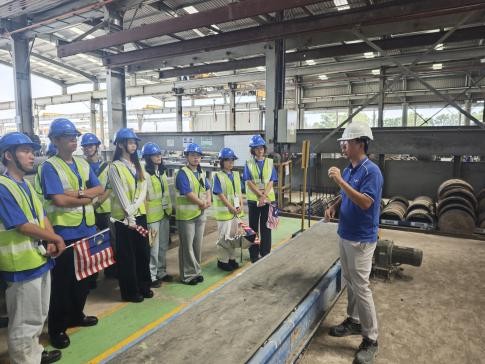 来到 2016 年投产的沙巴首个预应力高强度混凝土(PHC)管桩车间,C80级混凝土管桩的致密质地与高强度性能让队员们惊叹不已。大家围在管桩截面展示区,一边触摸材料表面,一边向技术人员请教 “预应力张拉工艺”“混凝土强度调控”等专业问题,课堂所学的材料力学理论在生产现场有了鲜活注解,思维碰撞间深化了对海外基建技术标准的认知。