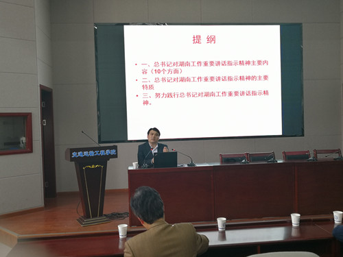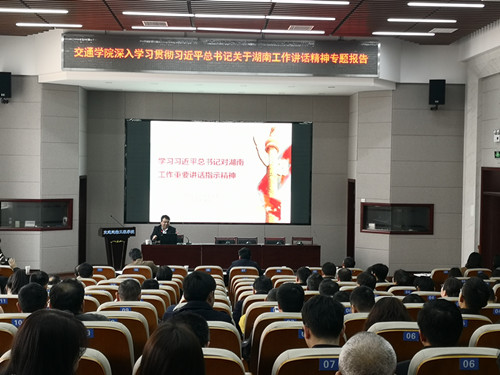 为认真落实省委巡视组关于巡视开云官网的反馈意见,深入贯彻落实习近平总书记关于湖南工作的讲话精神,3月19日下午,交通学院举办《深入学习贯彻习近平总书记关于湖南工作讲话精神专题报告会》,报告会由开云官网马克思主义学院党委书记易显飞教授主讲,院党委副书记田上主持,全院教职工参加。