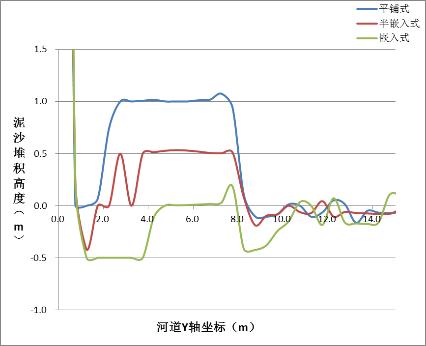 ①不同格宾铺设方式下雷诺格宾护脚效果分析。通过研究雷诺格宾在铺设方式为平铺式、半嵌入式、嵌入式的情况下的护脚效果,并利用流场图、泥沙堆积高度变化图对结果进行分析,得出铺设方式对格宾护脚效果的影响。