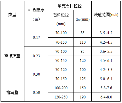 表1 雷诺护垫/格宾相关参数与水流流速参照表