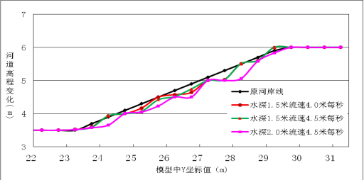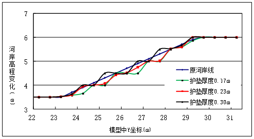 ①不同厚度和不同阻力系数的雷诺护垫护岸抗冲效果分析。通过研究当水深为1.5m、水流流速为4.0m/s时,采用厚度为0.17m、0.23m、0.30m三种雷诺护垫护岸;取三种护岸后河岸高程变化曲线进行对比分析得出雷诺护垫厚度对河岸抗冲效果的影响。