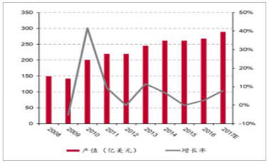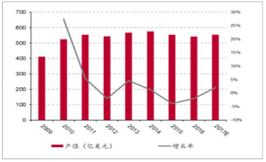 近年来,由于计算机和通讯等高科技产业的迅猛发展,为印刷线路板化学镀镍提供了广阔的发展空间。印刷电路板(PCB)是实现电子元件整体功能的重要部件。随着电子工业的高速发展,PCB的需求量与日俱增。经过几十年的发展, PCB行业已成为全球性行业,但近几年总产能呈现低速发展趋势。中商产业研究院数据显示,2016年全球 PCB市场产值达到542亿美元,虽相比2015年的市场产值下降2%,但仍是电子元件细分产业中比重最大的产业。未来在全球电子信息产业持续发展的带动下,全球 PCB市场有望维持2%左右增速。