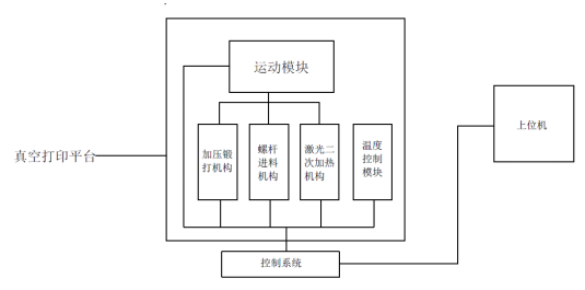 (4)真空微热压系统:主要由真空打印平台、打印层高频微震动加压机构和打印微区域预热机构组成,真空打印平台主要实现打印环境真空化,保证打印坯体致密度;打印层高频微震动加压机构对刚打印完的一层材料进行加压处理,使打印精度和质量更高;打印微区域预热机构对打印完的一层材料进行预热,使层与层之间的结合更加紧密;