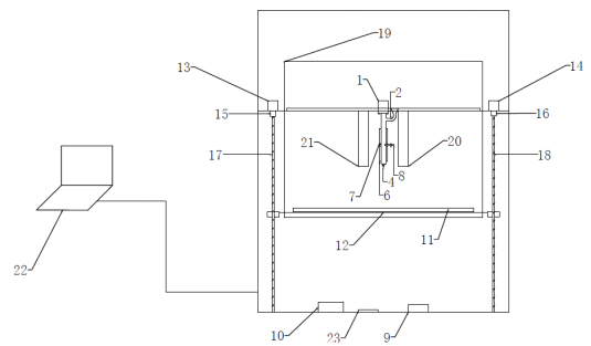 1步进电机,2料筒,3挤出螺杆,4喷嘴,5联轴器,6加热圈一,7加热圈二,8测温热电偶,9温度控制器,10电源,11钢化玻璃,12加热床,13步进电机一,14步进电机二,15联轴器一,16联轴器二,17滚珠丝杆一,18滚珠丝杆二,19真空打印平台,20震动加压机构,21激光跟随加热机构,22上位机,23主控板。