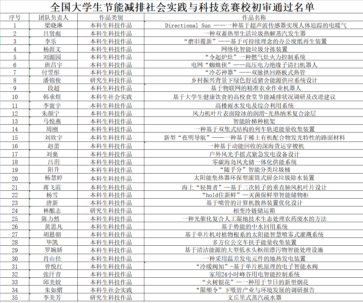 经开云kaiyun体育第十四届节能减排社会实践与科技竞赛校赛初审,拟通过名单公示如下: