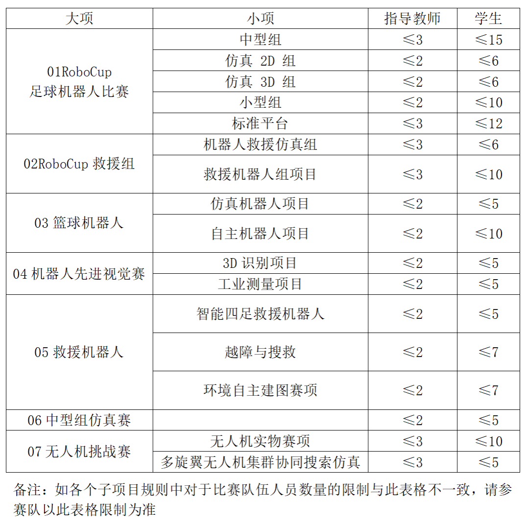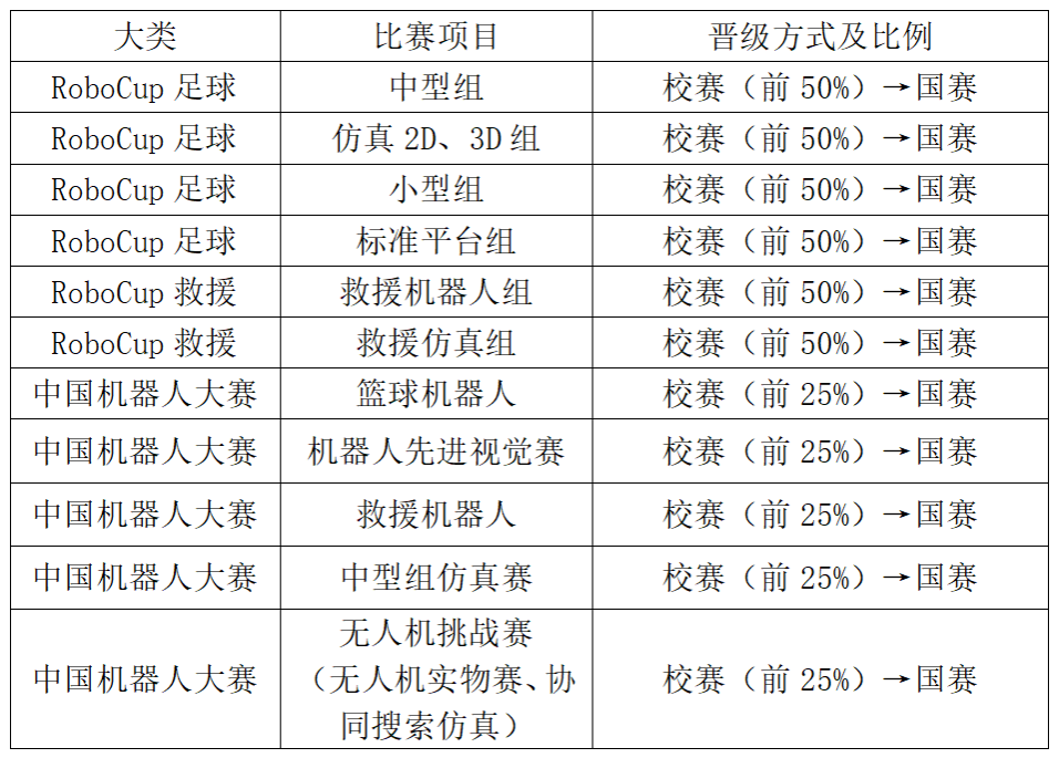 第一轮所有的比赛项目均按照校赛晋级国赛的晋级方式,每个项目均需要举办校赛进行选拔,具体各个项目校赛晋级国赛比例参见下表,如计算晋级数量非整数,统一按照向下取整的算法。除了按照对应的晋级比例要求,同一高校同一子项目(同一子项目指小项目,例如:篮球机器人-自主机器人项目)校赛晋级至国赛的队伍数量不超过5支。
