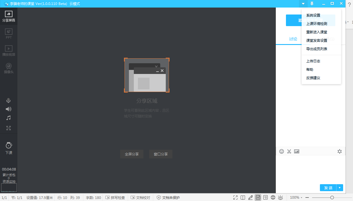 上课之前,点击右上角的“向下的三角形图标”,可以测试上课环境,设置课堂发言等。