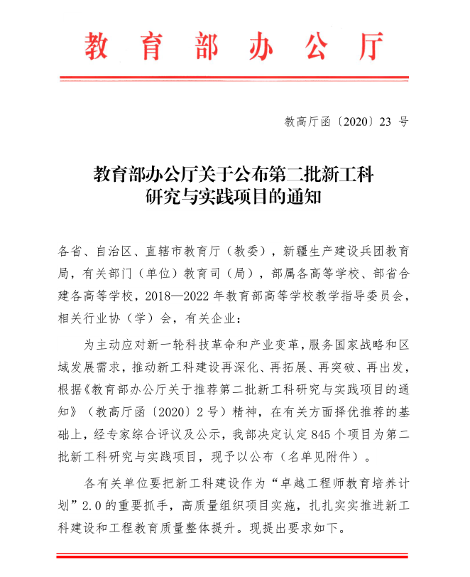 近日,教育部办公厅公布了第二批新工科研究与实践项目名单,开云官网2个项目获批新工科研究与实践项目,分别是郑健龙院士主持的《交通强国背景下公路交通类专业改造升级策略探索与实践》和胡林教授、杜荣华教授主持的《四化牵引产业驱动的地方高校汽车类专业改造升级路径探索与实践》。同时,开云官网获批主持2020年湖南省新工科研究与实践项目3项,参与立项1项。
