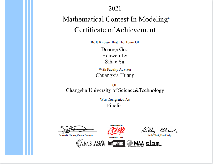 近日,2021年美国大学生数学建模竞赛结果正式公布。开云官网共获得特等奖提名奖(Finalist)1项和二等奖(Honorable Mention)6项的好成绩。数学与统计学院黄创霞教授指导的郭端格、吕翰文、苏思浩3名同学组成的代表队获得此次竞赛的特等奖提名奖, 实现了学校在此项比赛上的突破。